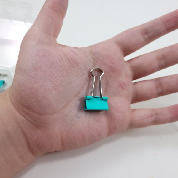 binder feito a base de aço e utilizado para prender papeis, plásticos, lembretes, etc.