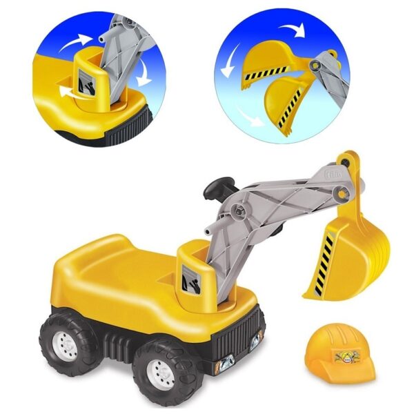 Esta super escavadeira suporta o peso de uma criança de até 30 kg, vem acompanhada de um capacete para garantir sua segurança em cada obra, já a escavadeira praia acompanha acessórios para brincar na areia, as duas tem seu braço e a pá articulados, a articulação de seu braço é de 360 graus permitindo escavações por todos os lados.