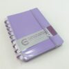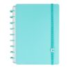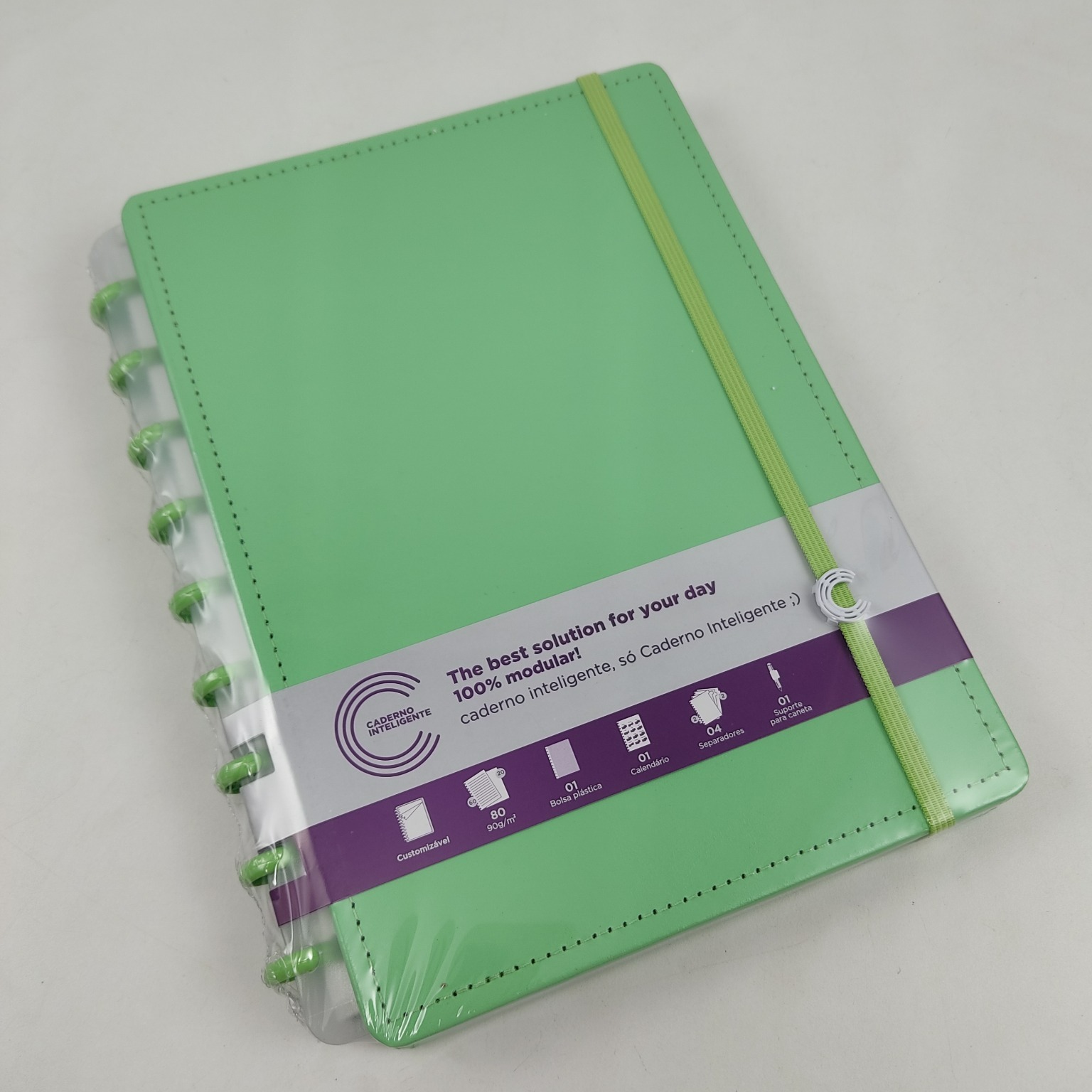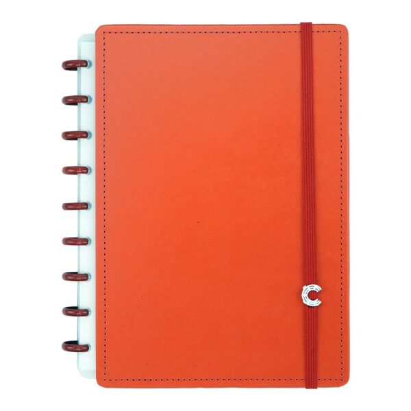 Capa e contracapa rígidas, 01 bolsa plástica, 01 folha de instrução de uso e manuseio, com refis e acessórios da marca disponíveis no verso, 01 folha de identificação com calendário no verso, 04 divisórias com abas para identificação, 80 folhas offset 90g (60 folhas pautadas e 20 folhas lisas brancas para impressão), 01 suporte com elástico para 01 caneta ou 01 lápis e discos M + elástico