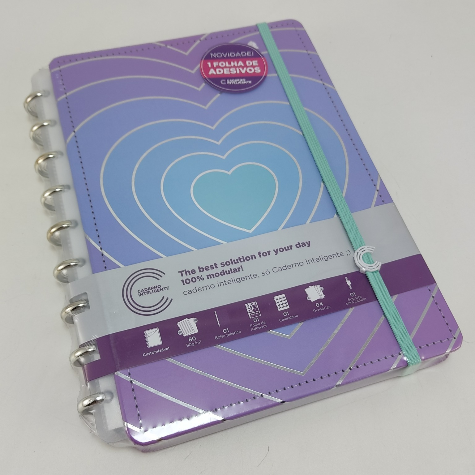 Capa e contracapa rígidas, 01 folha de adesivos, 01 bolsa plástica, 01 folha de instrução de uso e manuseio, com refis e acessórios da marca disponíveis no verso, 01 folha de identificação com calendário no verso, 04 divisórias com abas para identificação, 80 folhas offset 90g (60 folhas pautadas e 20 folhas lisas brancas para impressão), 01 suporte com elástico para 01 caneta ou 01 lápis e discos M + elástico.