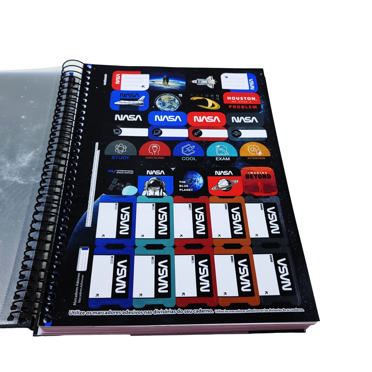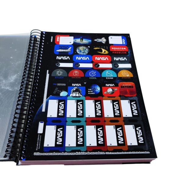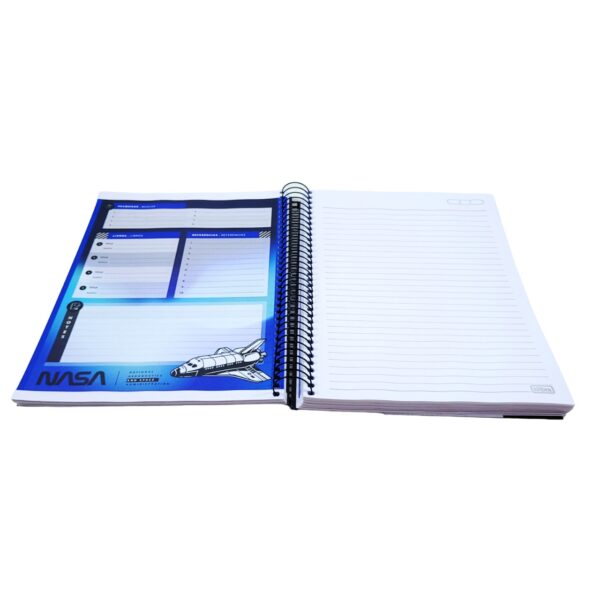 O Caderno Espiral Capa Dura Universitário 12 Matérias Nasa 192 Folhas possui capa dura com a parte interna decorada, bolsa plástica para guardar trabalhos e anotações, folha com adesivos funcionais, folhas pautadas e espiral colorido. Ideal para o dia a dia na escola ou na faculdade.
