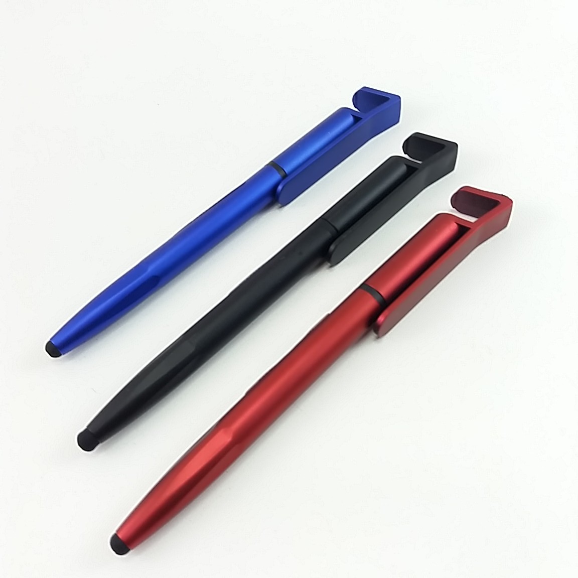 Caneta plástica touch com suporte para celular, caneta inteira colorida com detalhes preto. Clip plástico aberto utilizado como suporte para o celular e parte superior com limpador de tela, possui anel preto abaixo do clip e parte inferior com detalhes em relevo. Aciona por giro