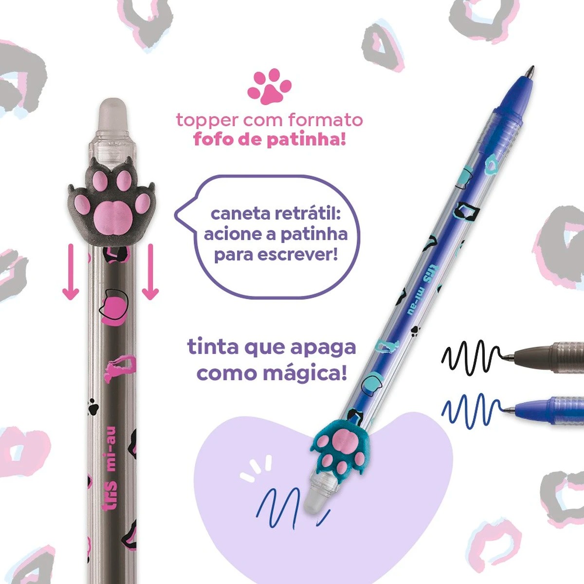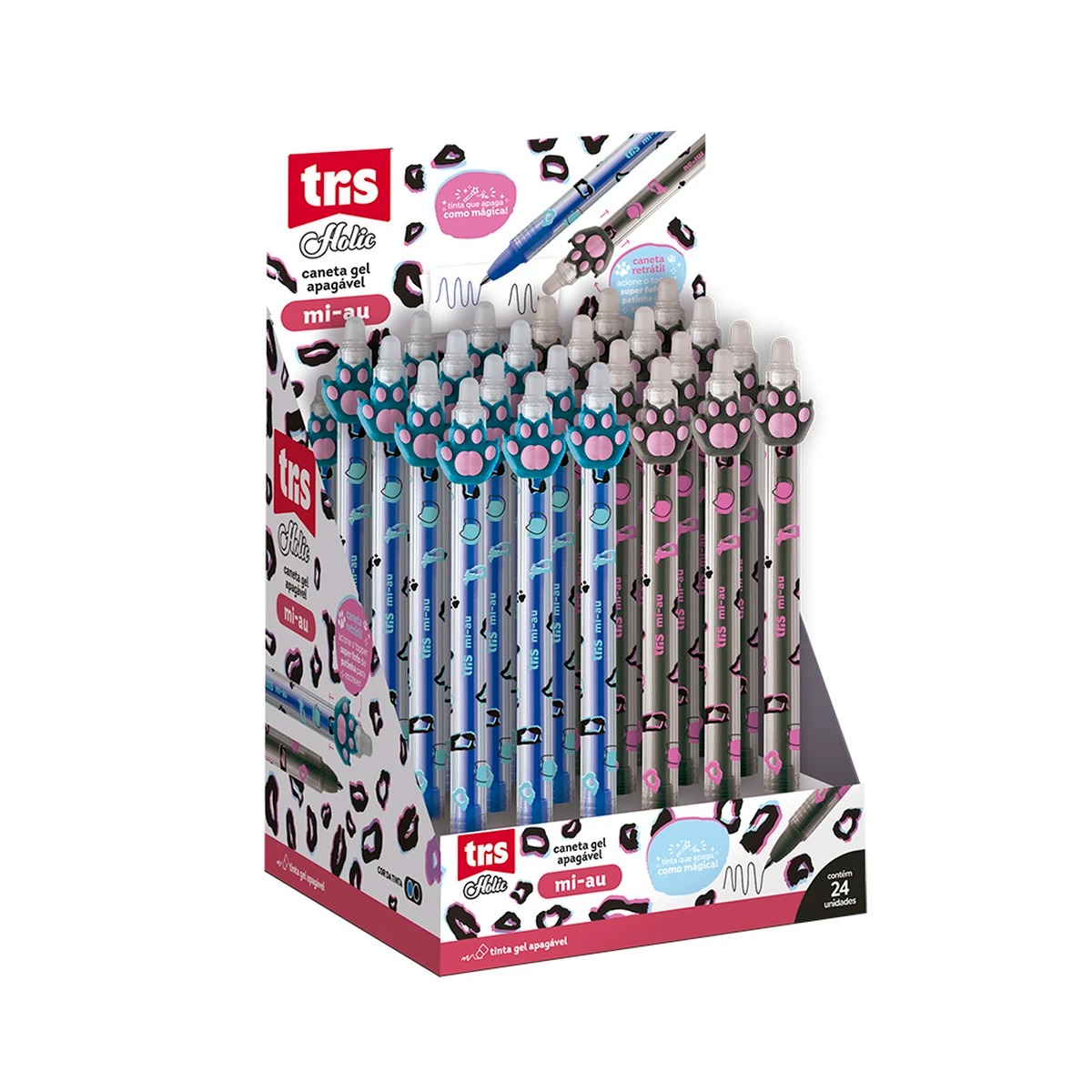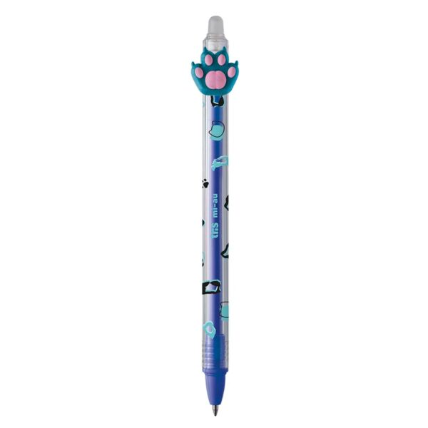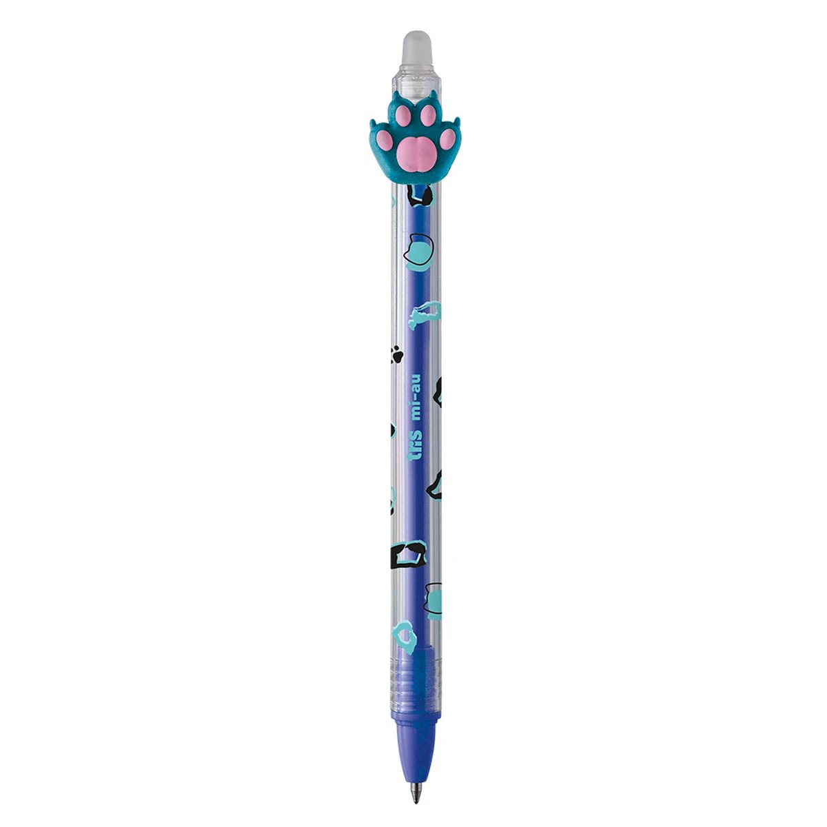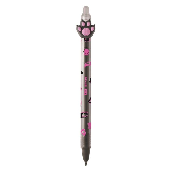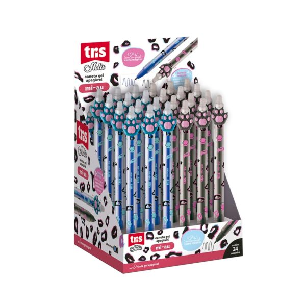 A caneta gel apagável Tris Holic Mi-Au possui corpo decorado e toppers divertidos.