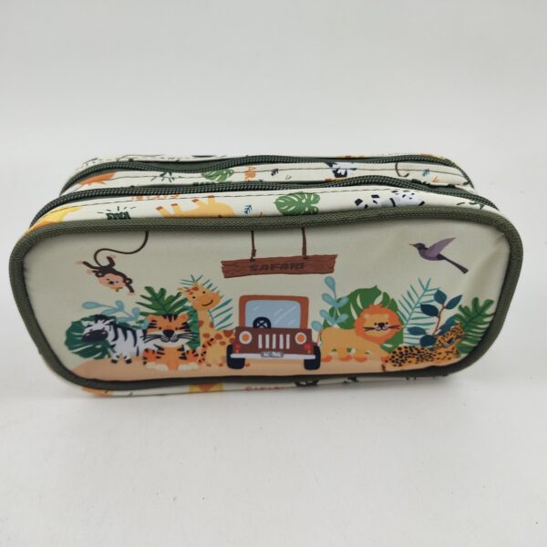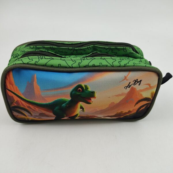 Kids Dino 2 compartimentos veio para dar sequência ao nossos fofos e divertidos dinossauros. Produzido em sua grande parte de Poliéster, um material muito resistente. Possui fechamento em zíper com puxador em metal, painel em PVC e, além disso, tem 2 compartimentos para você manter seus lápis e canetas mais organizado.