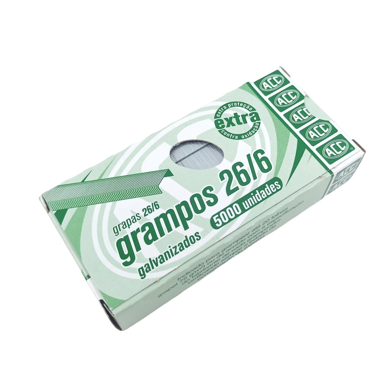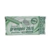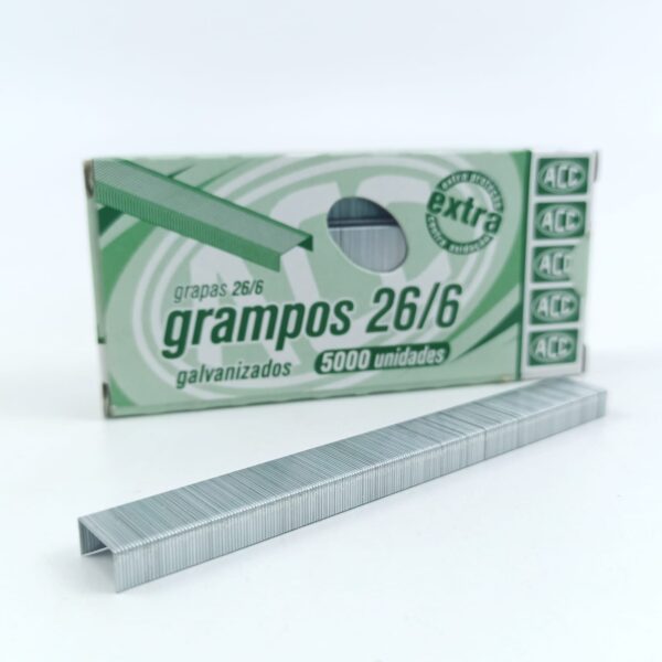 Os grampos 26/6 cobreados/galvanizados, são fabricados com arame de aço revestido resistente à oxidação. Indicados para grampear até 20 folhas (papel 75 g/m²) ou de acordo com a especificação do fabricante de cada grampeador, verificando sempre o estado de conservação do mesmo. O número 26 refere-se ao tipo do grampo e 6 refere-se ao tamanho da perna em milímetros.