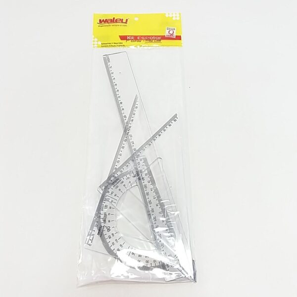O Kit Escolar 1° Grau New Line Waleu possui um conjunto de réguas especiais e essenciais no dia a dia do aluno seja em fase escolar. O Kit 1° grau é composto por: 1 régua de 30cm, 1 esquadro de 45°, 1 esquadro de 60° e 1 transferidor 180°. Fabricado em poliestireno, possui 3mm de espessura oferecendo resistência e durabilidade. Produto certificado pelo INMETRO.